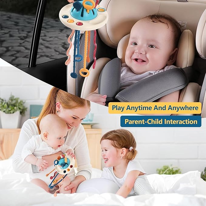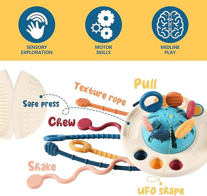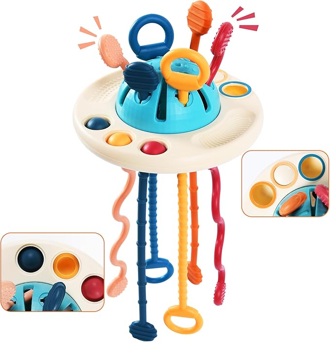 Barvita senzorična igrača v obliki letečega krožnika spodbuja raziskovanje z dotikom, vlečenjem in pritiskanjem. Različne teksture in gibi pomagajo razvijati fino motoriko, koordinacijo in radovednost že od najzgodnejših mesecev.
